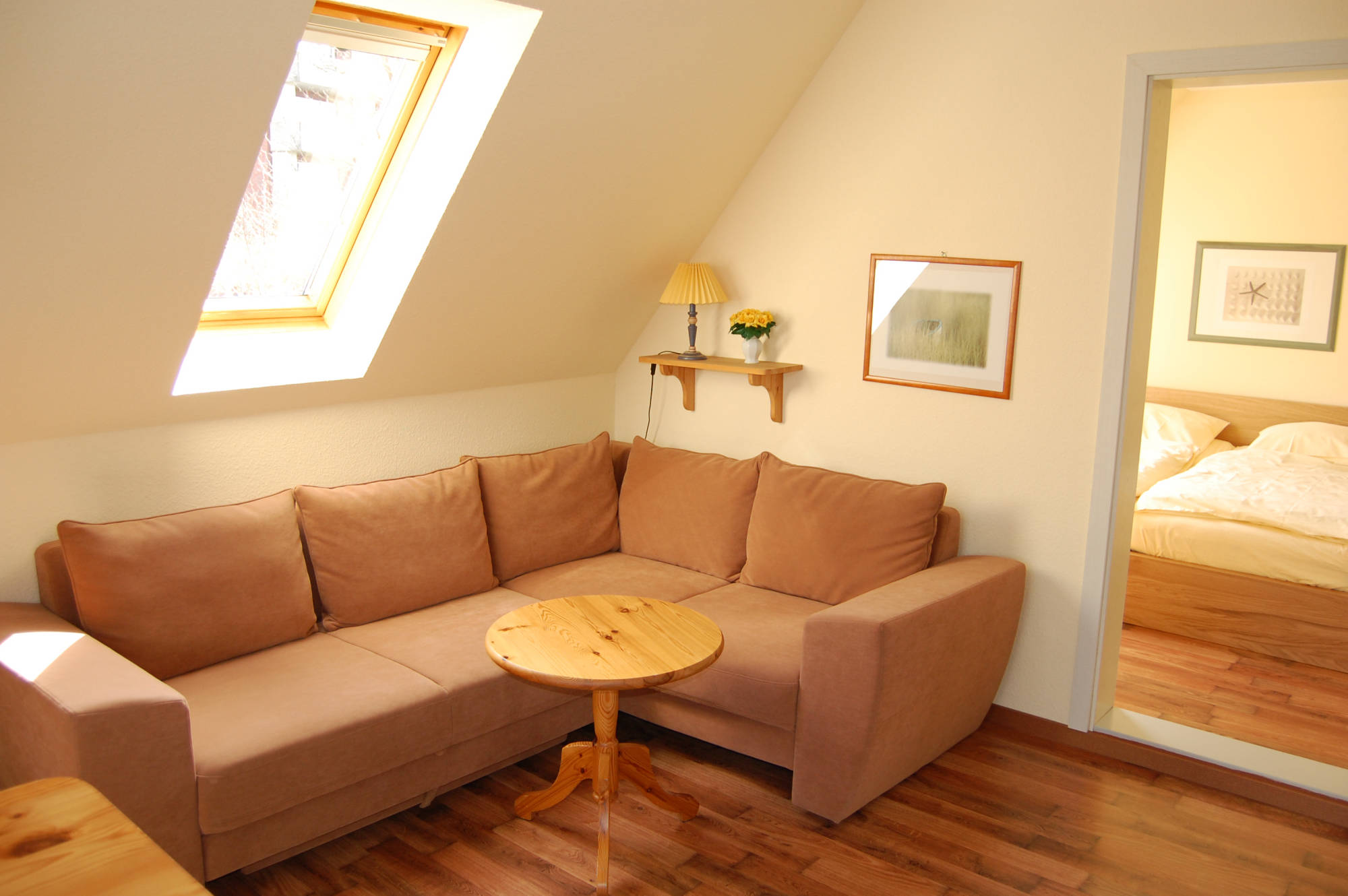 Der Blick aus dem Fenster geht zum Deich und in unseren Garten. Dort steht eine Sitzfläche zur Verfügung.