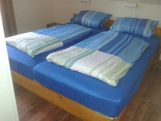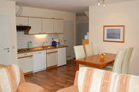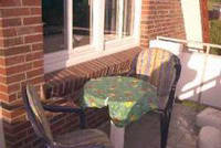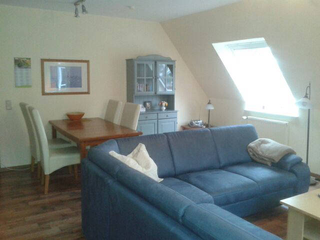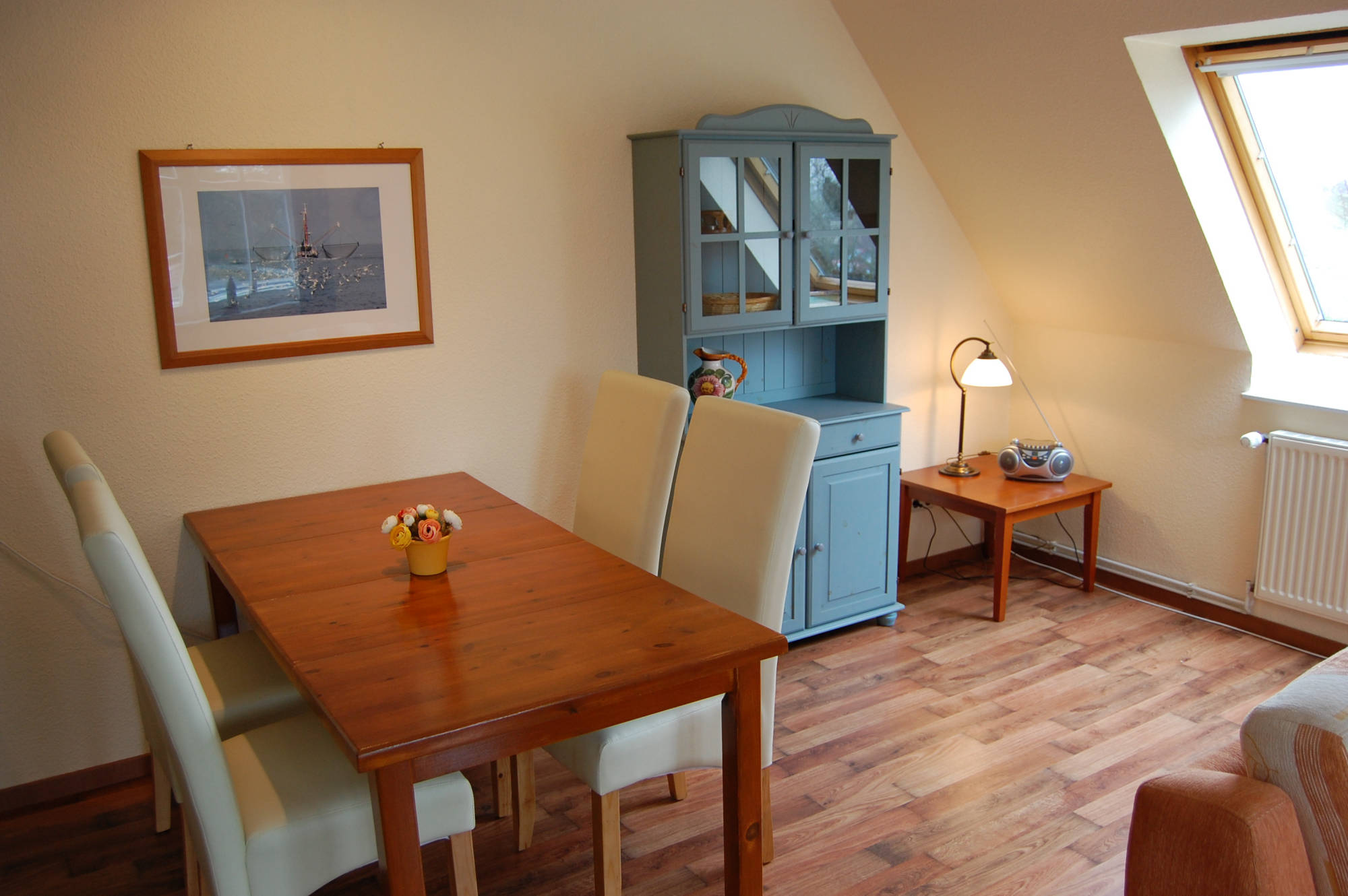 Die Wohnung Mellum ist 45 m² groß, liegt im Obergeschoß und hat einen Südbalkon. Sie verfügt über ein großes Wohnzimmer mit Essbereich und Küchenzeile, ein Schlafzimmer mit einem Doppelbett, Bad mit Dusche. Eine Spülmaschine ist vorhanden. Ein Kinderbett und ein Hochstuhl sind ebenfalls vorhanden. Ein Fahrradschuppen, ein Strandkorb und ein Bollerwagen können genutzt werden.